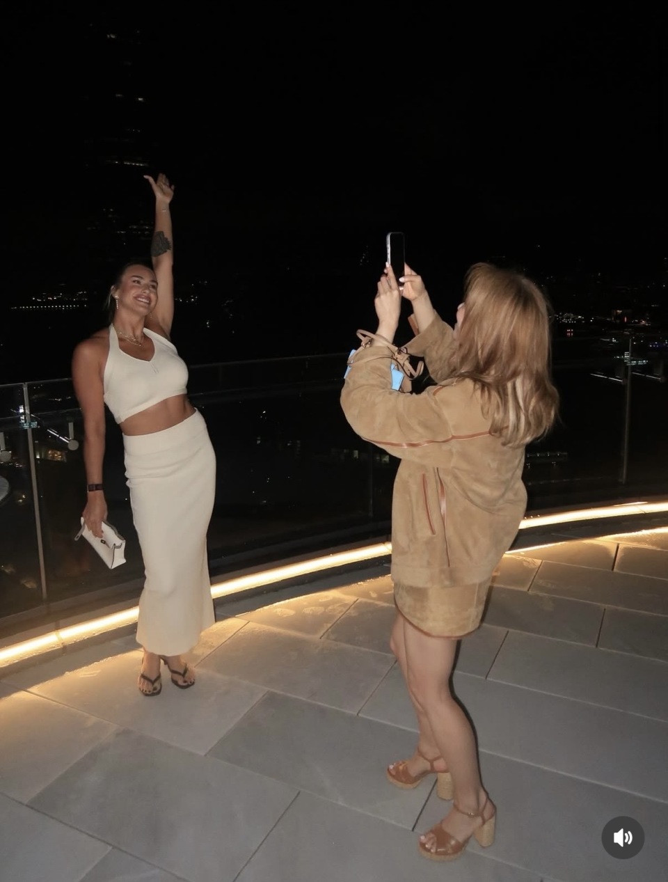 萨巴伦卡醉心香港夜景,拍了好多美丽的夜景照,徐子淇作为女主人全程相伴,甚至还主动为对方拍照,尽展作为地主的热情,让萨巴伦卡尽兴而归。徐子淇当天打扮不见特别,一身驼色的套装,驼色的短裙,驼色的外衣,鞋子也是驼色的,就是很标准的贵妇装扮,不过气质还是出众的。同场的还有萨巴伦卡的陪练员,另外,在天台看夜景的时候,李家诚也到场参与合照,他打扮休闲,穿了阔腿裤以及休闲夹克,不过四人合照中,李家诚是最矮的一位。